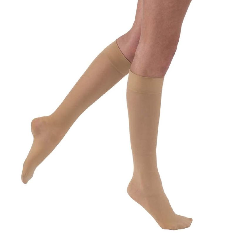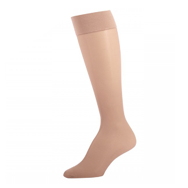 Media No-Varix hasta la rodilla para dama, talla small y color beige. Compresión progresiva 15–20 mmHg para aliviar cansancio, pesadez e inflamación, con diseño transparente y cómodo para uso diario.