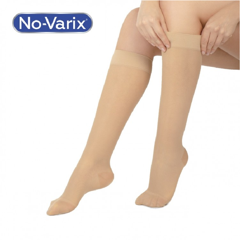 Media médica No-Varix hasta la rodilla con compresión media 15–20 mmHg, color beige y talla X-Large. Ayuda a aliviar cansancio, dolor y pesadez en las piernas.