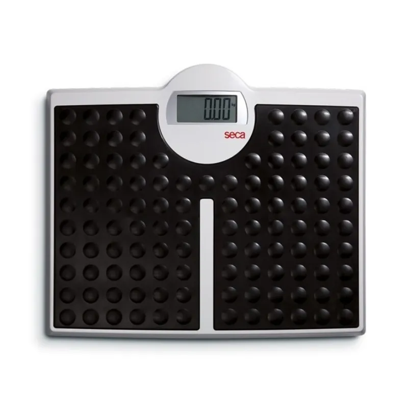 Báscula electrónica robusta Seca 813, ideal para pacientes con sobrepeso. Capacidad 200 kg, activación automática, plataforma amplia y antideslizante.
