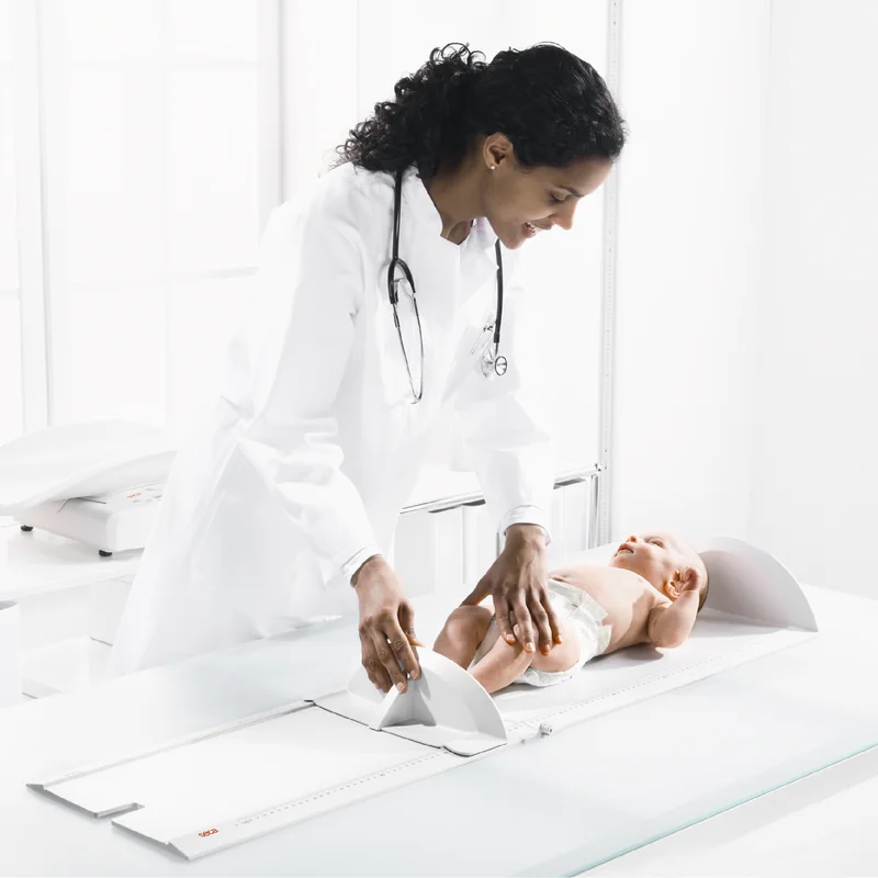 Con un rango de medición de 10 a 100 cm y una división precisa de 1 mm, este infantómetro cumple con los estándares más exigentes para el monitoreo del crecimiento infantil. Sus topes para cabeza y pies con ángulo de 90° garantizan un posicionamiento correcto del bebé, mientras que el tope para los pies deslizante se mueve suavemente sobre guías especiales para mediciones exactas y reproducibles.
