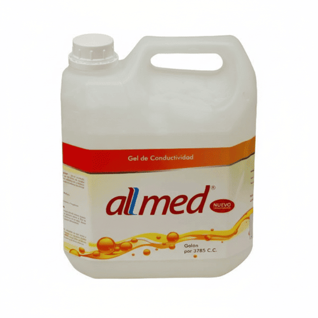 Allmed Galón 3785 cc – Gel de ultrasonido transparente para uso clínico con pH neutro y alta viscosidad, hidrosoluble y libre de sal/alcohol. Mejora la conductividad en ecografía y ultrasonido terapéutico, ideal para clínicas y fisioterapia.