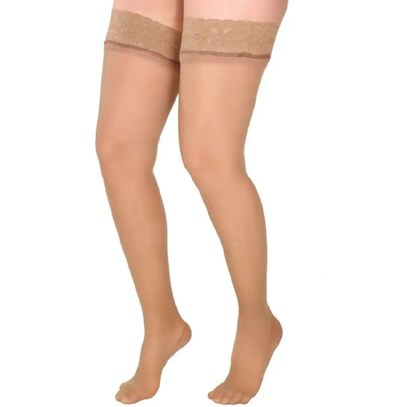 Media No-Varix hasta el muslo color beige x large con compresión progresiva media (15–20 mmHg). Ideal para aliviar cansancio y pesadez en las piernas.