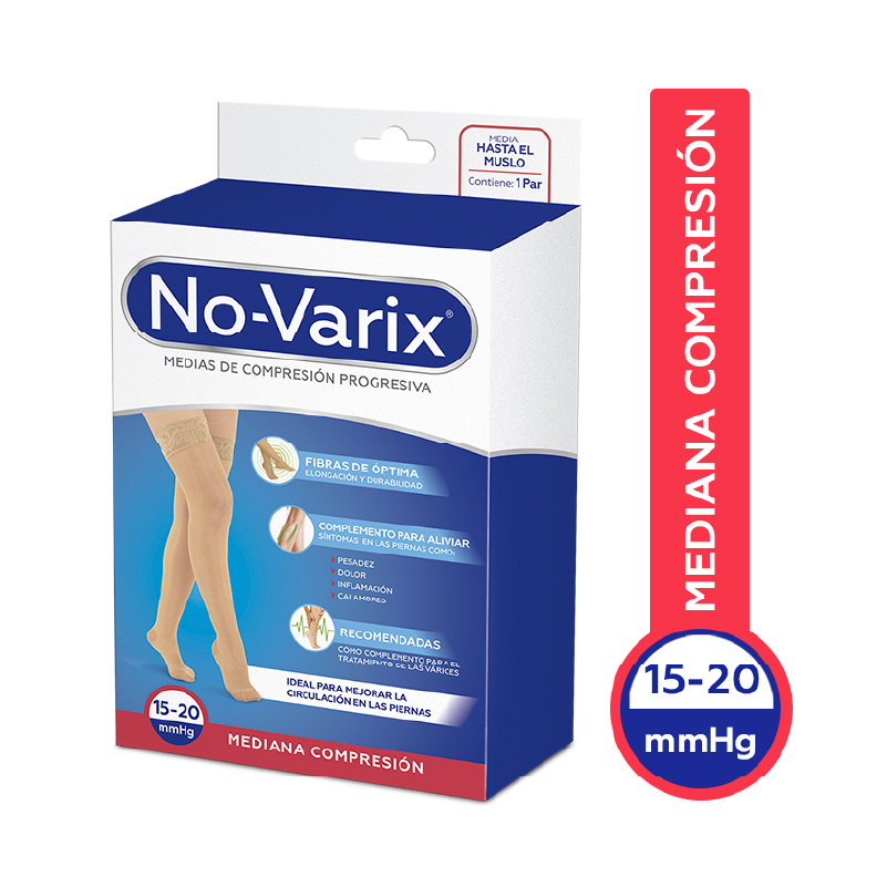 La media No-Varix muslo med ajust beige x large es una media médica no invasiva de compresión progresiva media (15–20 mmHg), indicada para el manejo y alivio de molestias venosas como cansancio, dolor, inflamación y pesadez en las piernas.